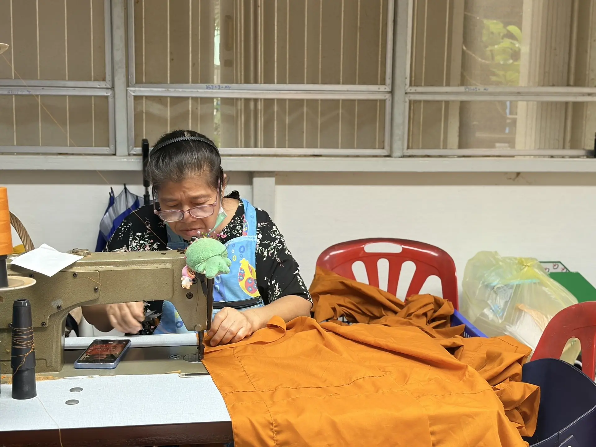 經過堆滿布料和縫紉機的工坊,僧人介紹,製作一套完整的僧袍需要60個1.5公升的寶特瓶。目前僧袍採用50%寶特瓶紗與50%棉混紡,兼顧透氣與舒適。對僧人而言,這延續了佛陀鼓勵僧侶使用廢布縫袈裟的傳統,也減少塑膠進入河川與海洋,同時為周邊社區與弱勢族群創造穩定收入。