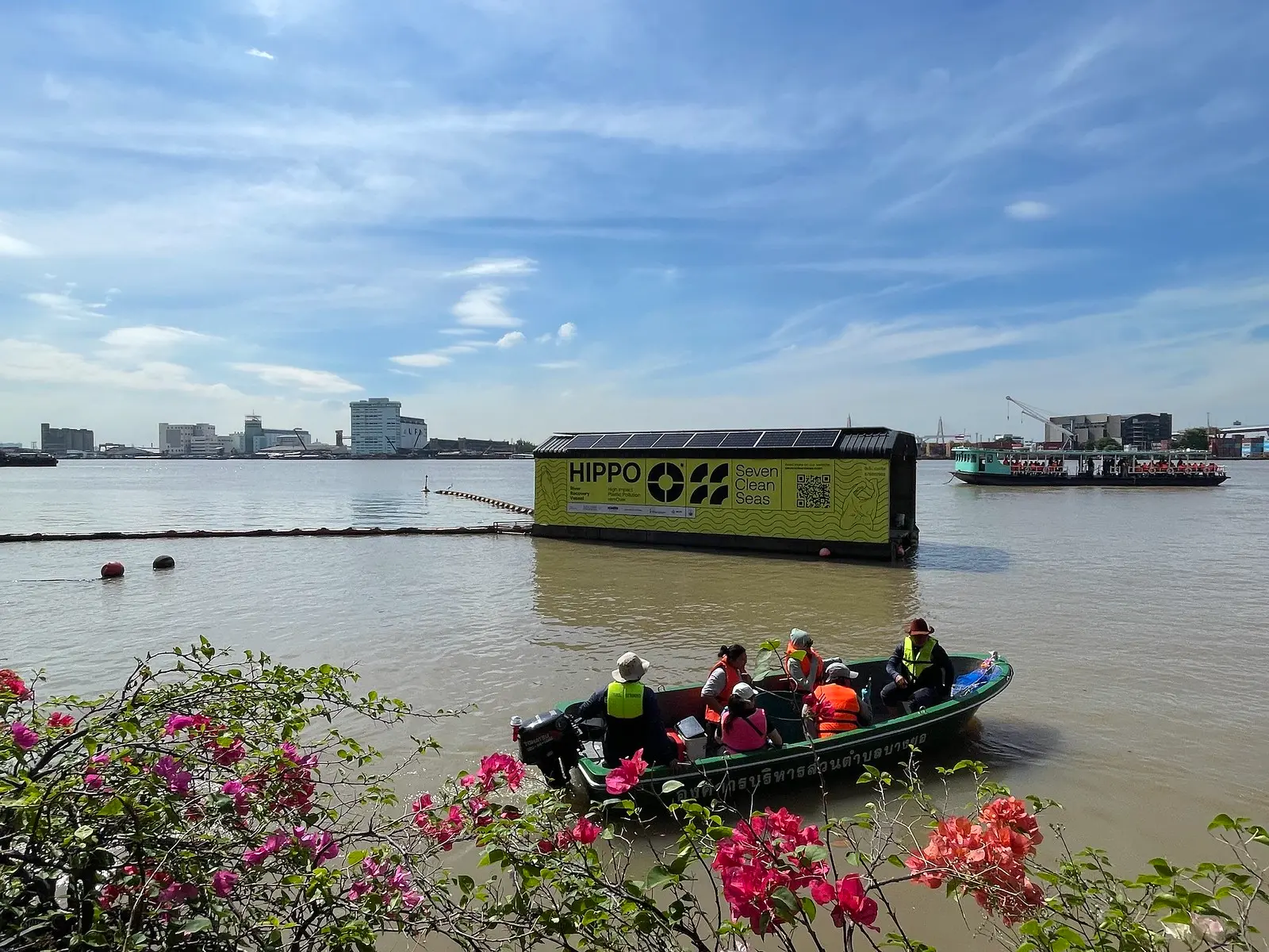 從紅寺緊鄰河流,住持仍記得,80年代時孩童在河裡嬉戲、民眾甚至能生飲河水的景像。但當住持接手時,充滿惡臭的河川已奄奄一息,布滿髒污不堪的塑膠廢棄物。寺方引入與海洋潔淨基金會(The Ocean Cleanup)相仿的太陽能動力垃圾收集平台「河馬(Hippo)」,在昭披耶河的上游攔截與打撈漂浮的塑膠廢棄物。這天,已有許多志工投入河川清理的行列,我們與講師群一起登上小船,沿著運河撈取殘留的水燈與漂浮垃圾。