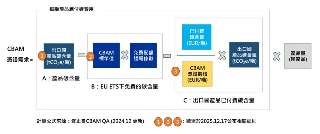 業者進口特定產品到歐盟,需購買並繳交CBAM憑證,但要怎麼計算憑證數量?根據歐盟17日發布的細則,計算公式涉及三個項目:產品碳含量、免費配額、企業在母國已付出的碳價。
