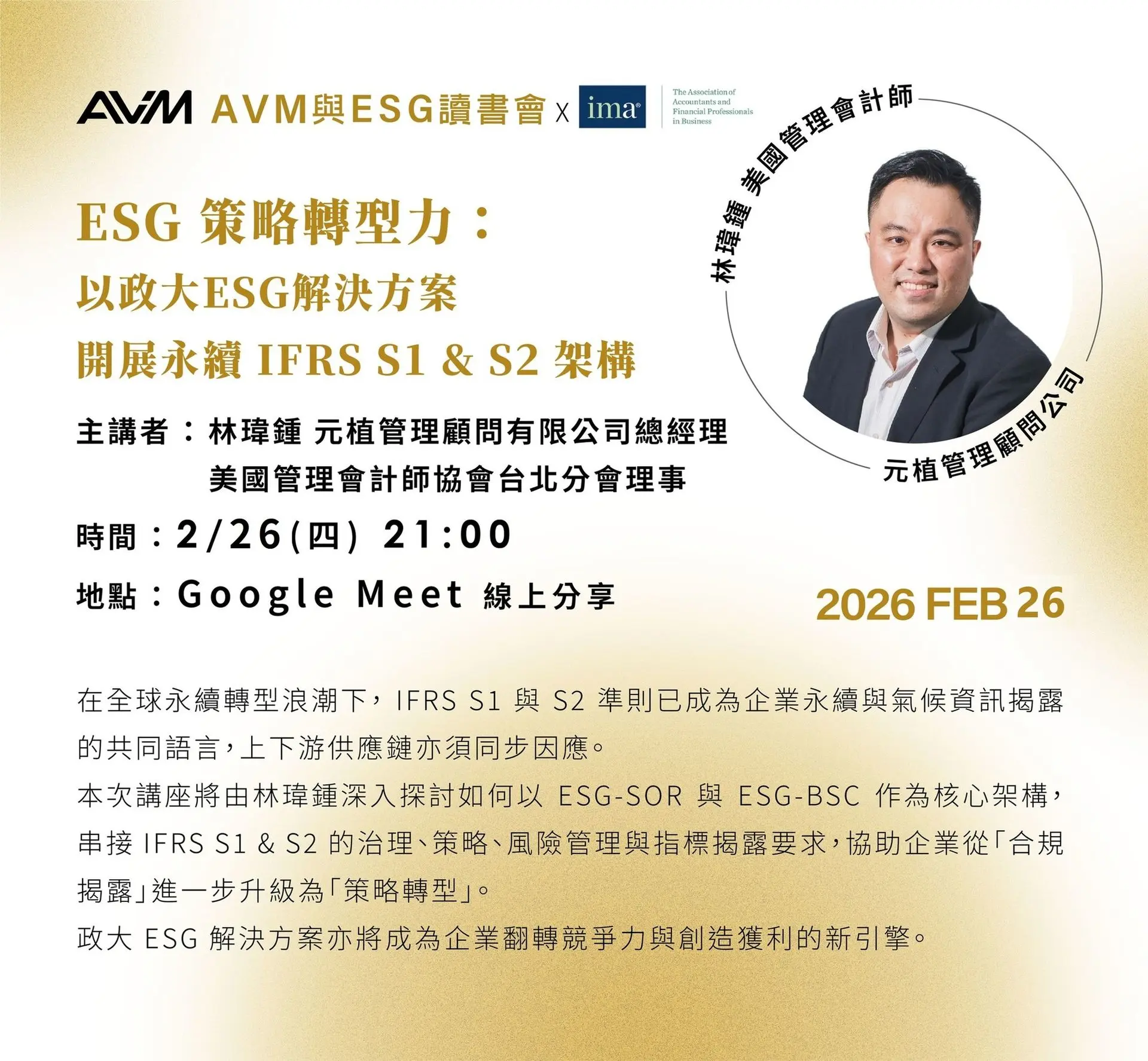 2026 年 2 月 26 日晚間,由 IMA 台北分會 與 AVM與ESG讀書會社群 共同舉辦之「ESG 策略轉型力」線上公益講座圓滿完成。本次活動吸引超過 1,400 位專業社群成員參與,並透過五大專業社群同步擴散,展現企業永續議題在財會與管理領域的高度關注。