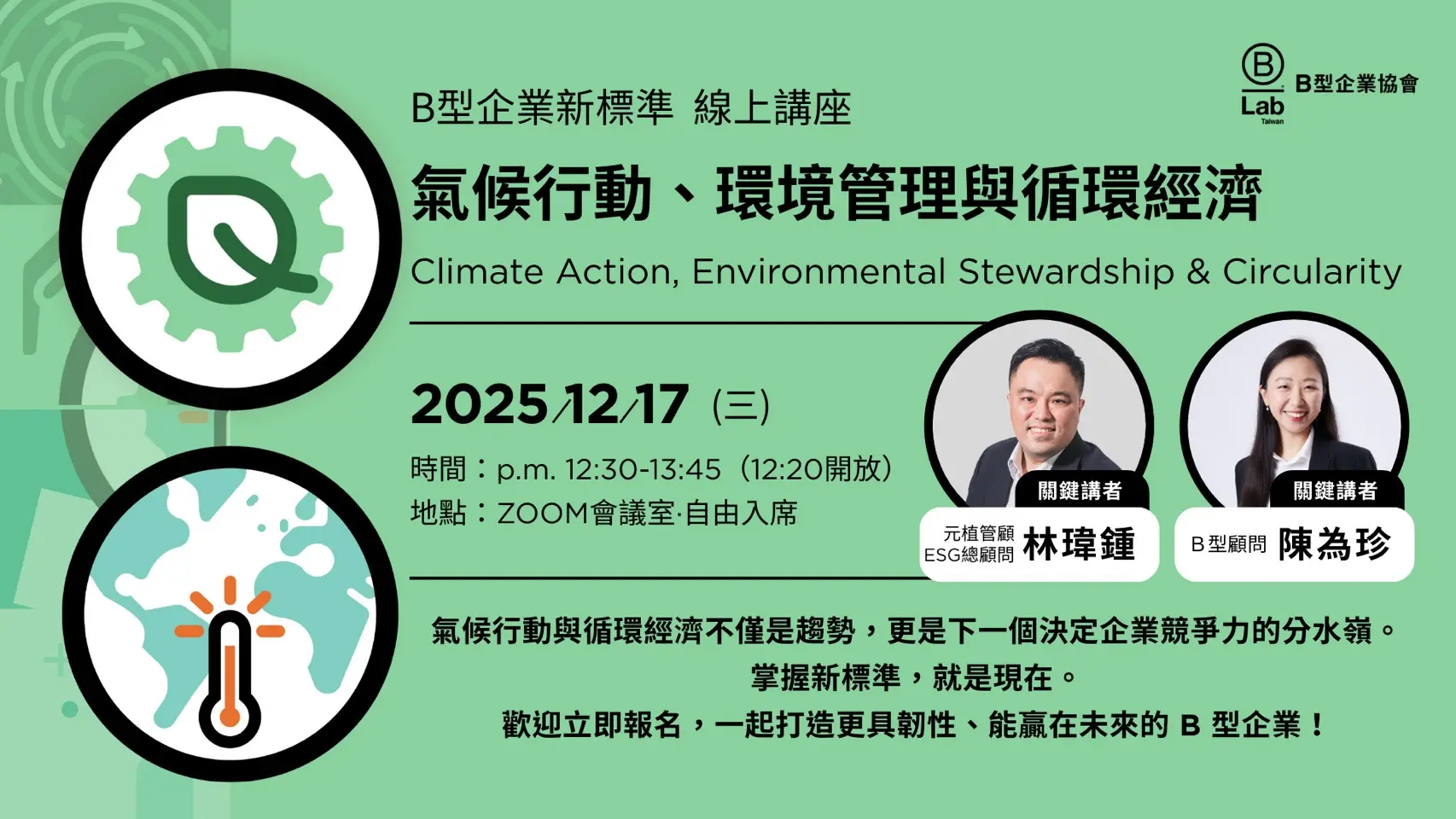 ESG4U 參與分享第七版 B 型企業新標準中「氣候行動、環境管理與循環經濟」實務案例,從循環經濟談到公正轉型,協助企業以具體行動落實氣候責任、避免漂綠。